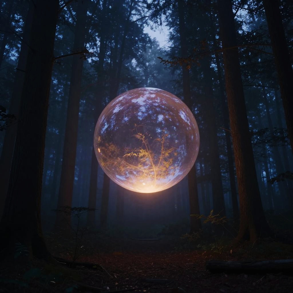 Unidentified glowing orb floating above a misty forest at dusk, ethereal light reflecting on the treetops, mysterious atmosphere, cinematic lighting, soft shadows, deep blue and purple hues, high detail, surreal landscape