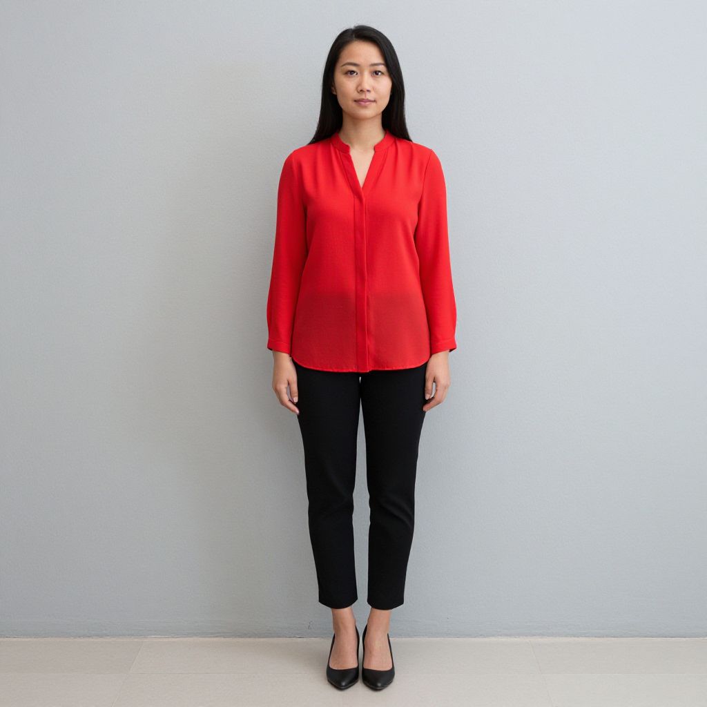 Photograph of an Asian woman with long black hair standing against a plain light gray background. She is wearing a bright red, long-sleeved blouse with a V-neck and black, ankle-length trousers. Her black high-heeled shoes have a pointed toe. She stands with a neutral expression, arms relaxed by her sides. The lighting is even, highlighting the vibrant red of her blouse against the otherwise muted colors. The floor is a light, almost white, wood texture. The overall style is simple and professional, with a focus on the contrast between the red blouse and black pants.
