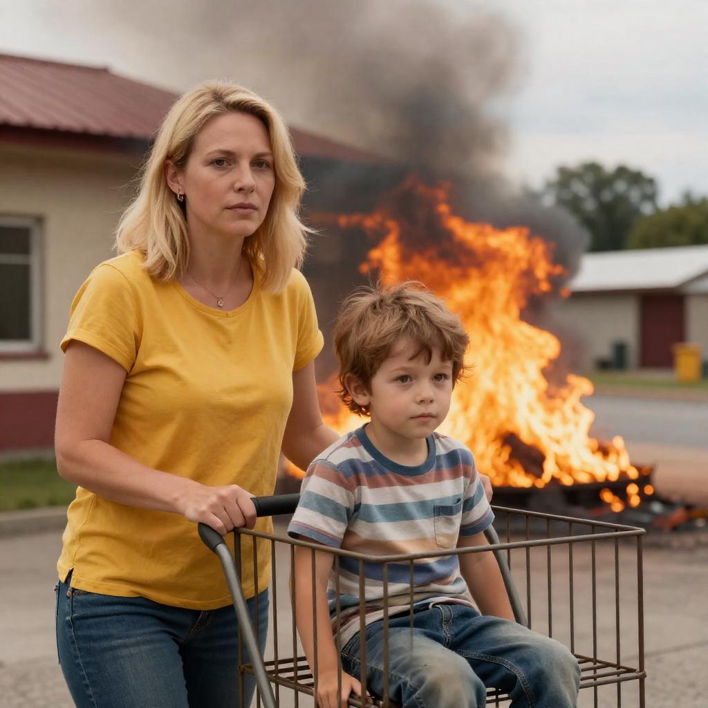 Photograph of a young boy and a woman. Boy with short brown hair, downcast eyes, wearing a dark jacket with brown straps. Woman with blonde hair in a bun, light green shirt, serious expression, right hand on boy's shoulder, left hand on red-checkered bag. Background: blurred sky and trees. Woman's left arm around boy's shoulder. Both standing.
