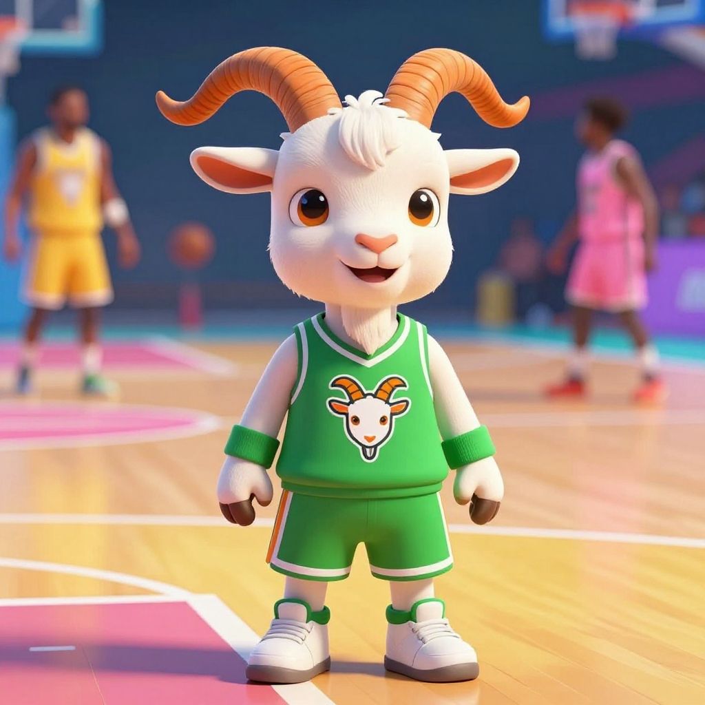A detailed digital illustration of an anthropomorphic goat with large orange horns and white facial fur, standing on a brightly lit basketball court. The goat is wearing a green basketball jersey and shorts with an orange and white goat logo on the chest, complemented by green wristbands and white sneakers. The vibrant, colorful court has a dynamic lighting setup with blurred figures of players in yellow and pink jerseys in the background, creating a cinematic sports atmosphere.