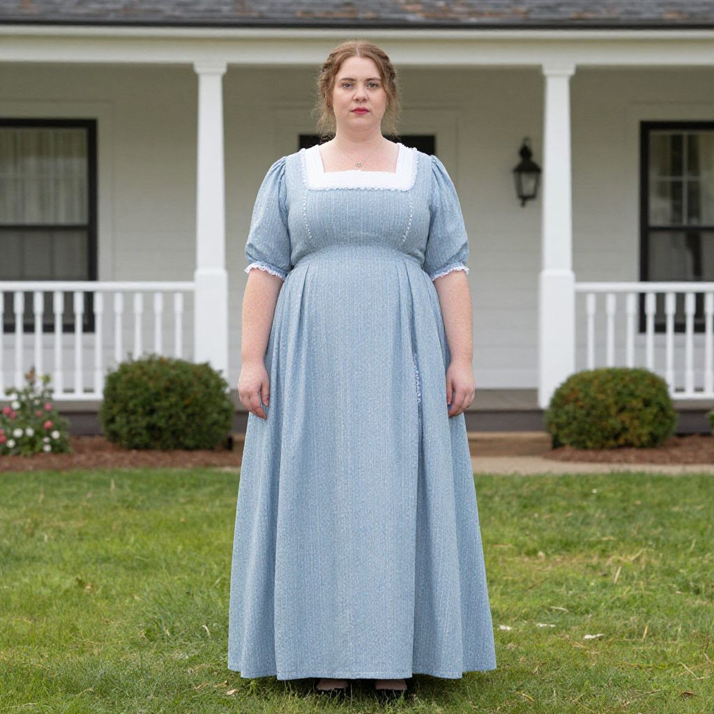 "Woman Clara Barton Plus Size Costume, woman in period dress standing in front of a house"