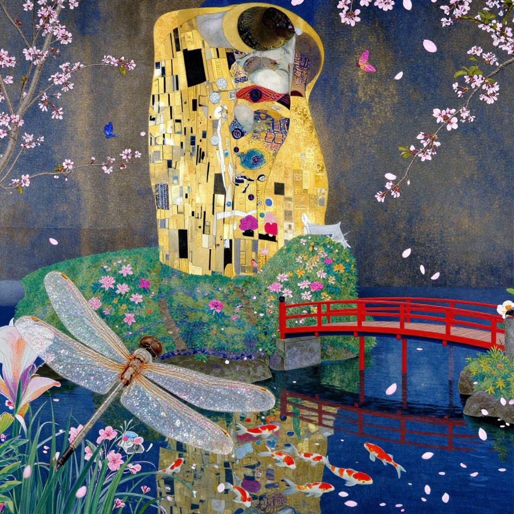 Envision a Japanese garden infused with the vibrancy of Klimt's palette, as seen from the perspective of a fluttering dragonfly. Amidst this tranquil oasis, cherry blossoms sway gently in an ethereal dance, their petals shimmering like delicate butterflies against the rich gold and deep blue hues that envelop the scene. A traditional red bridge stretches gracefully over a crystalline pond, where koi fish glide beneath the surface in serene harmony. This enchanting composition, with its skin-like surfaces of leaves and flowers, masterfully blends the beauty and mystique of nature's elegance into an unforgettable visual experience.