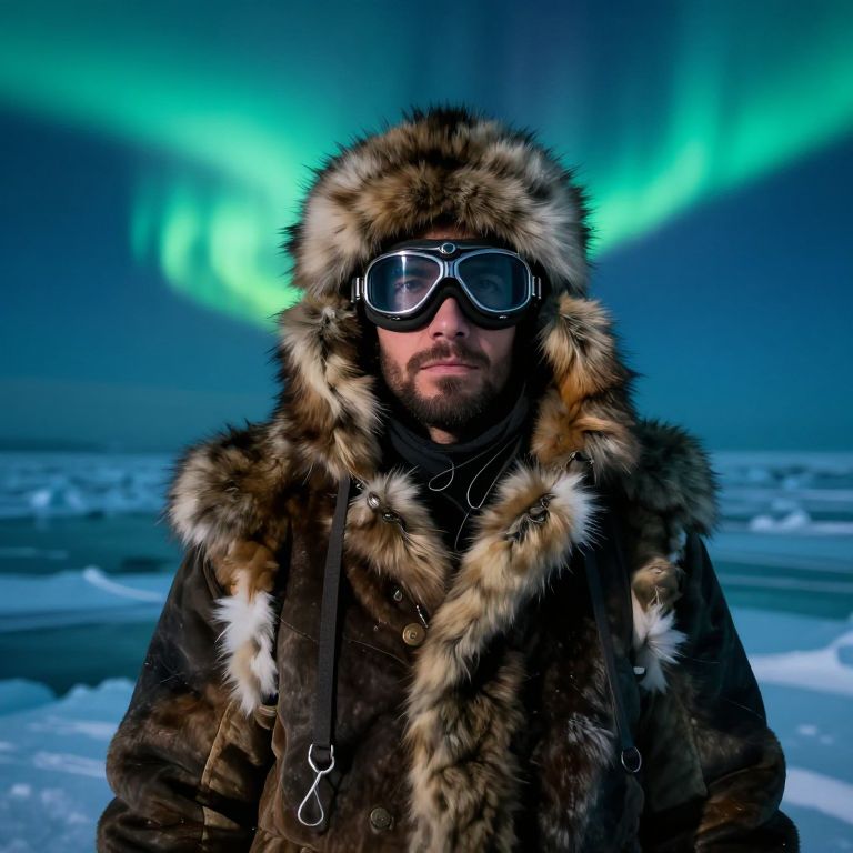 Portrait of a garctic explorer wearing heavy fur-lined clothing and vintage goggles, standing in front of a frozen ocean with aurora borealis, dramatic lighting, realistic textures, cold color palette