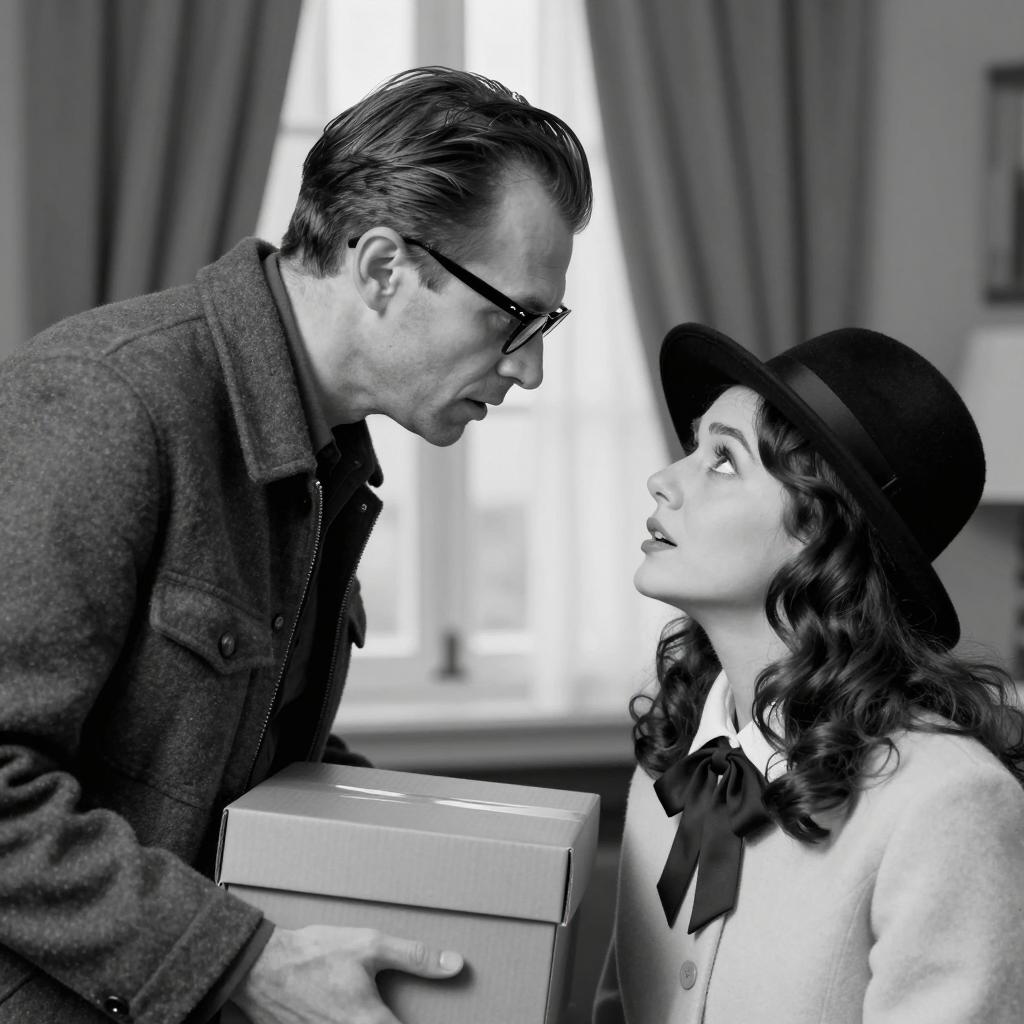 Photograph of a man and woman in a dimly lit setting. The man has dark brown hair, glasses, and a white shirt with a brown cardigan. The woman has curly brown hair and wears a red top. They face each other closely, smiling slightly. A bright light source is behind the woman, illuminating her hair. Dark background with blurry shapes and a small, glowing light. Both individuals are positioned on the left and right sides of the frame.