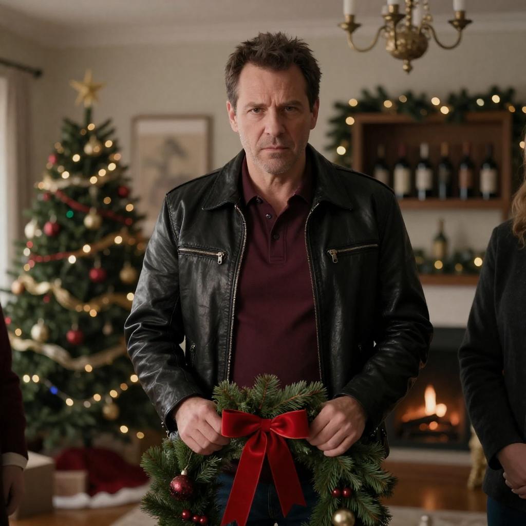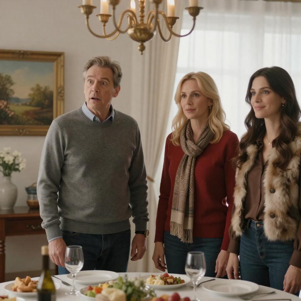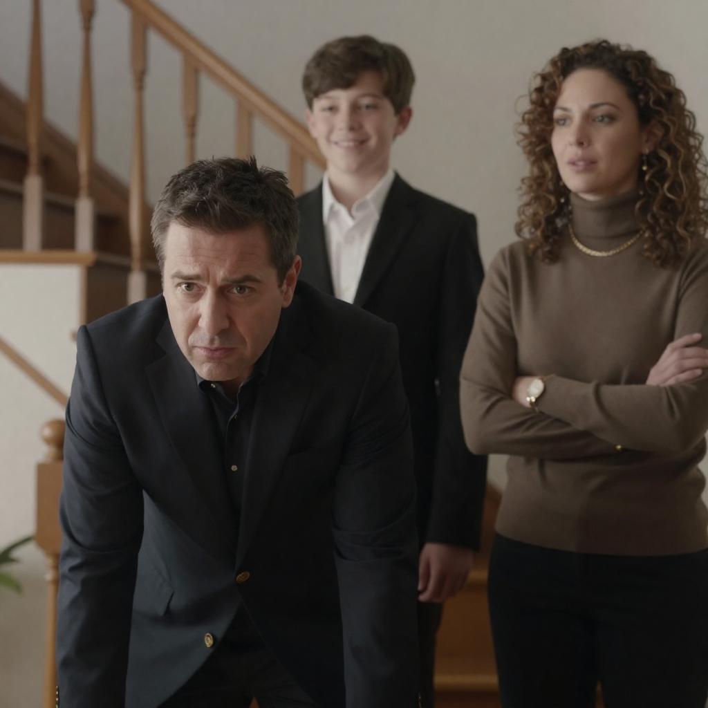 Photograph of a family scene: a middle-aged man with short dark hair, wearing a black suit and gold cufflinks, leans forward with a slightly confused expression. A young boy with brown hair, in a black suit and white shirt, stands behind him, smiling. A woman with curly brown hair, wearing a brown turtleneck and gold necklace, stands to the right with arms crossed, looking to the side. They are in a home with a wooden staircase in the background.