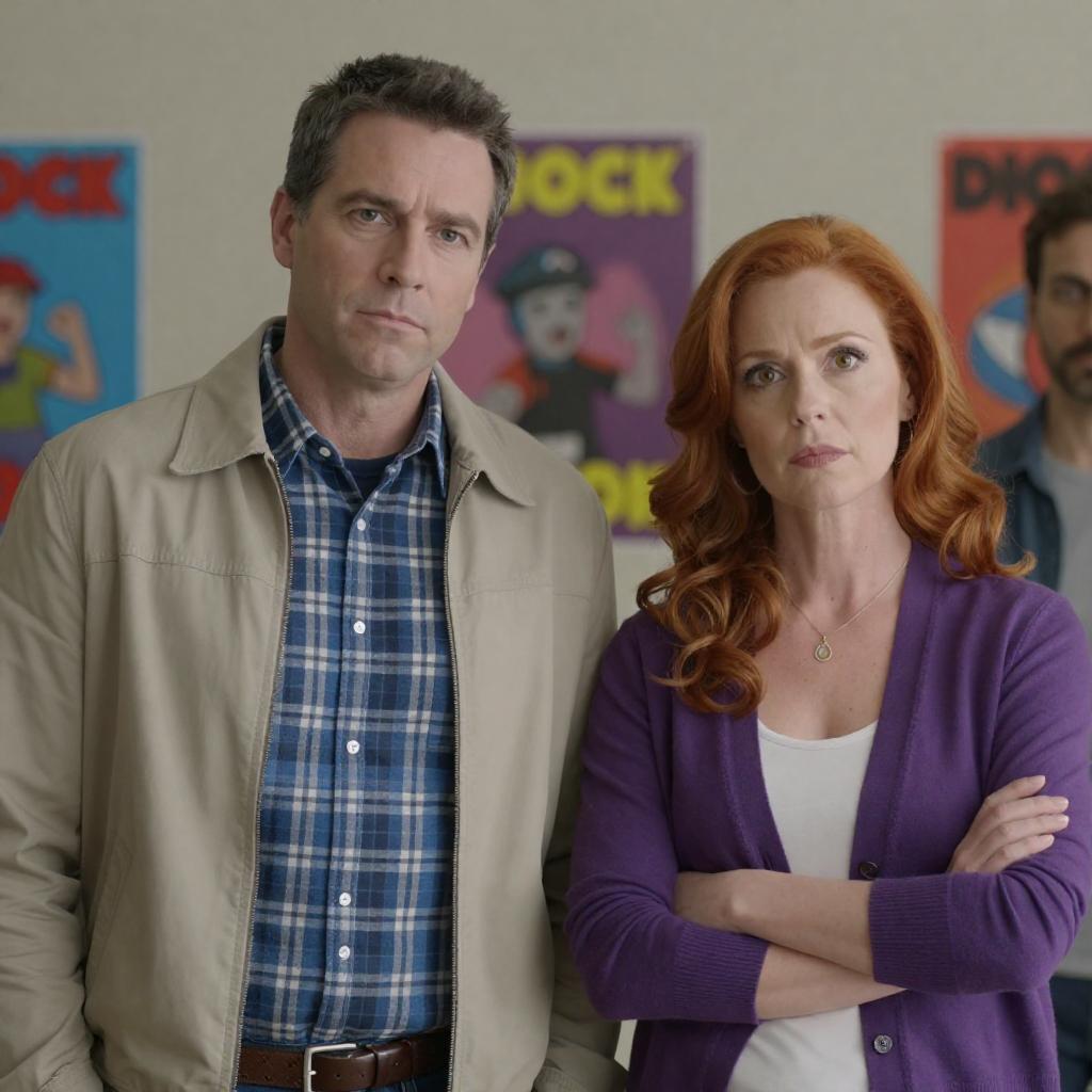 A middle-aged man with short dark hair wearing a black suit leans forward with a confused expression in a home setting. Behind him stands a smiling young boy in a black suit and white shirt. To the right, a woman with curly brown hair wearing a brown turtleneck and gold necklace crosses her arms looking to the side. The background features a wooden staircase.