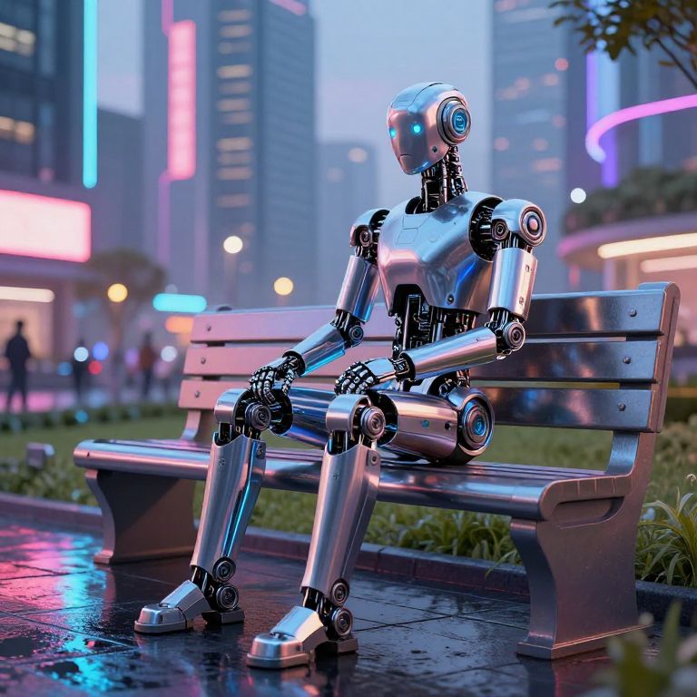 Robot sitting on a futuristic park bench in a neon-lit cityscape during twilight, reflective metallic surface glowing softly, cyberpunk style with intricate mechanical joints and expressive digital eyes, wet pavement reflecting colorful lights