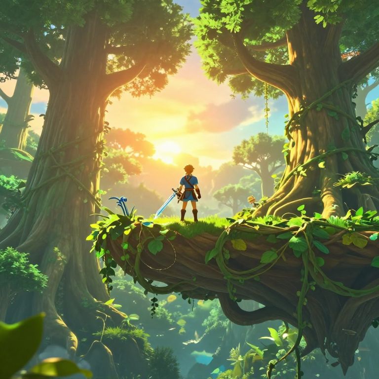 Imagine an immersive digital art composition inspired by the enchanting realm of \"The Legend of Zelda,\" observed from an otherworldly 'bug's-eye perspective.' In this scene, a valiant hero stands atop a mesmerizing platform woven with vines and leaves, hovering between the roots of towering ancient trees. The platform is bathed in the warm glow of the setting sun filtering through the dense forest canopy above. As the hero prepares to face an unseen danger wielding their legendary weapon, the artwork captures the dynamic tension and beauty of this moment, skillfully blending elements of nature with the magical world of Hyrule, evoking a sense of adventure, mystery, and awe within the viewer.