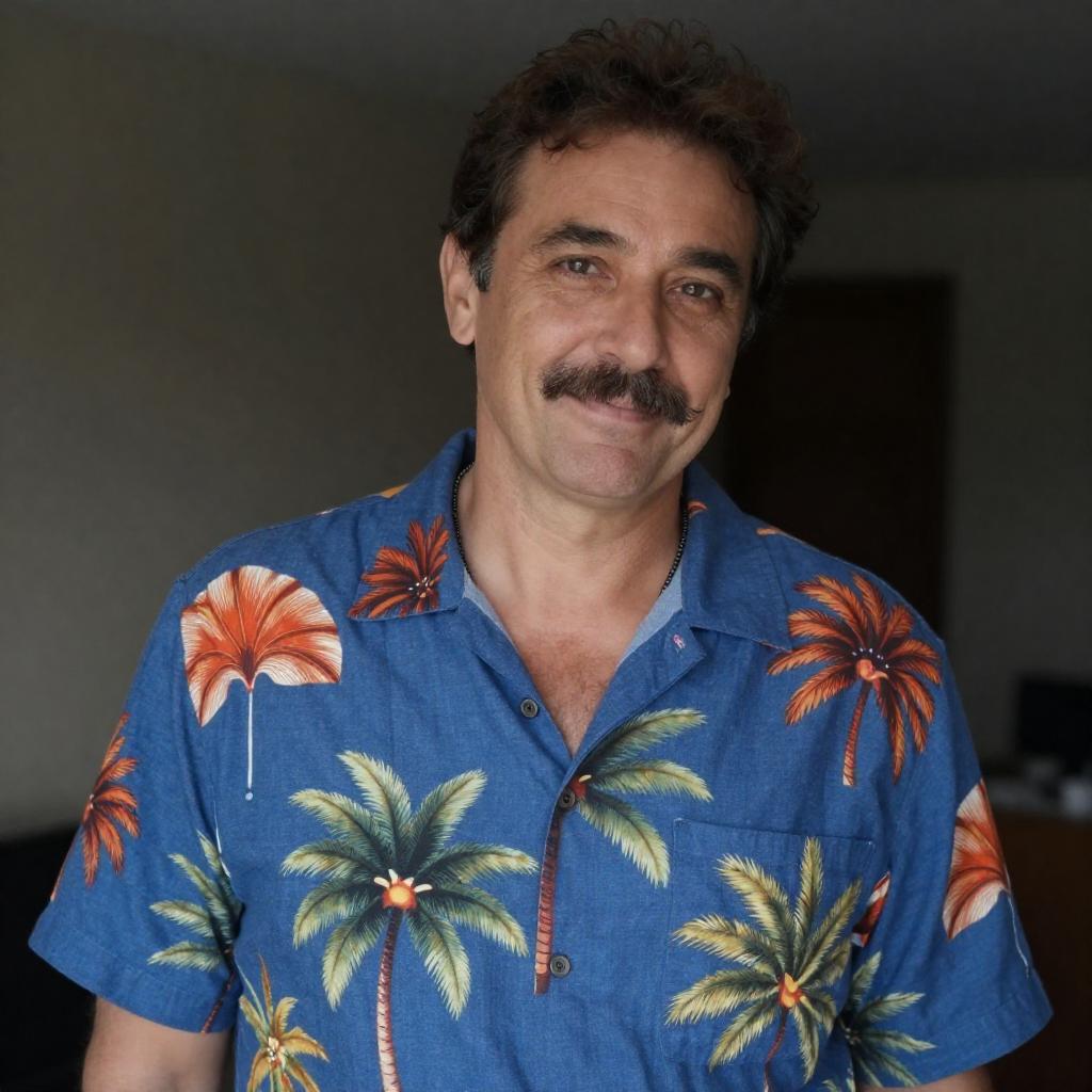 Portrait of a middle-aged man with brown curly hair and a mustache, wearing a blue short-sleeve shirt with colorful tropical palm tree and floral patterns. He is standing indoors in a dimly lit room, smiling softly with a relaxed and casual pose. A small necklace is visible around his neck.