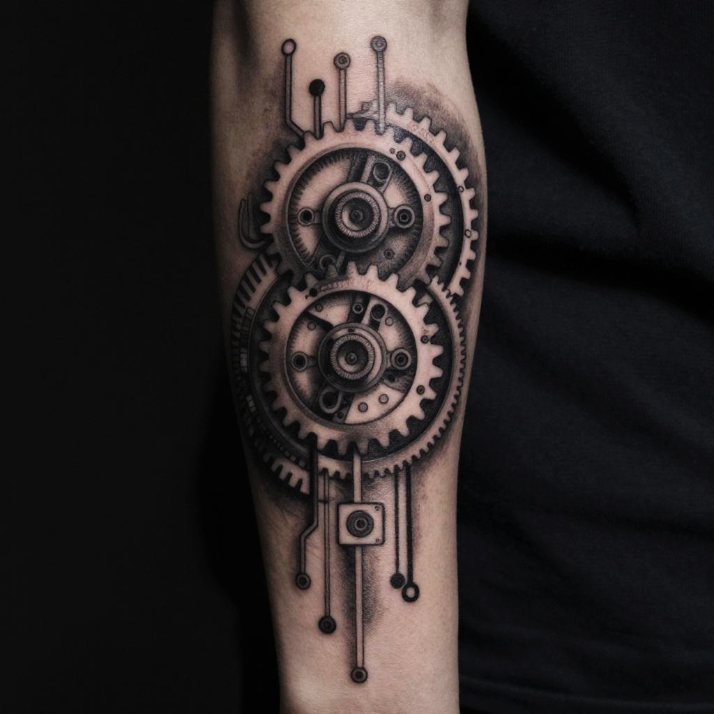 Futuristic monochromatic tattoo concept with mechanical gears and circuit elements, detailed line work and soft shading creating a sci-fi-inspired arm piece