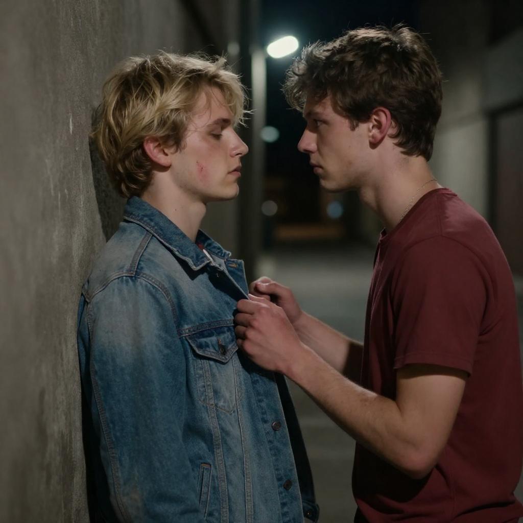 Young man with messy brown hair and pale skin wearing a grey t-shirt grimaces in pain, holding his head with one hand. Beside him, a bald man with stitched scars on his face leans in closely, wearing a black leather jacket. The scene is tense and intense, with a blue-tinted background and a third figure partially visible, emphasizing emotional conflict or confrontation.