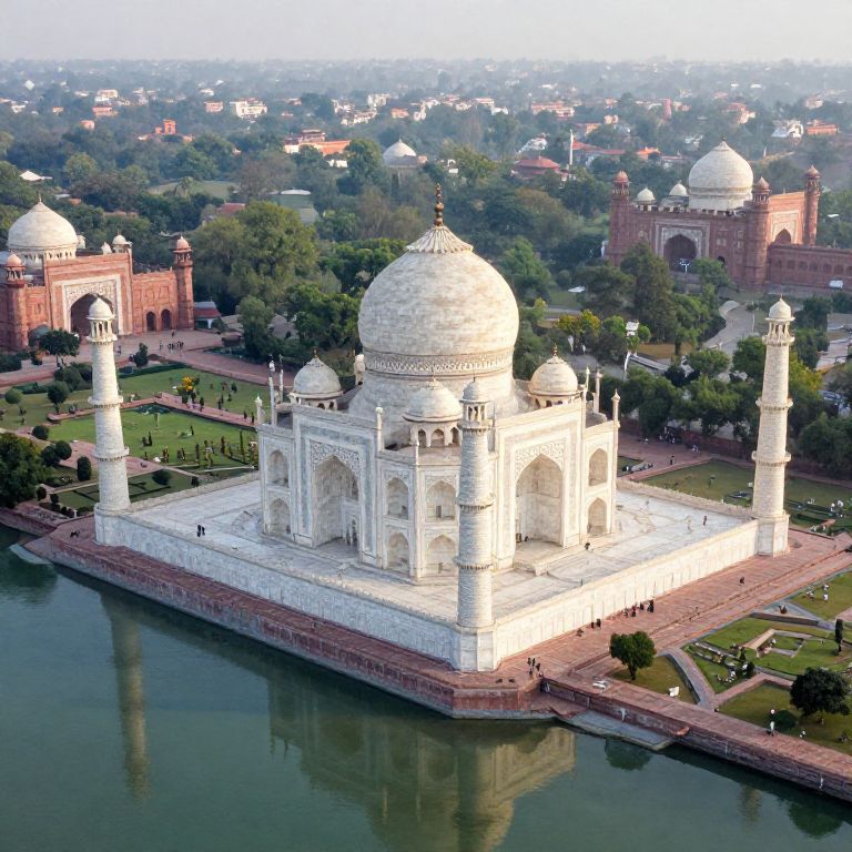 Aerial photograph of the Taj Mahal, an iconic white marble mausoleum with four minarets, surrounded by lush greenery and red