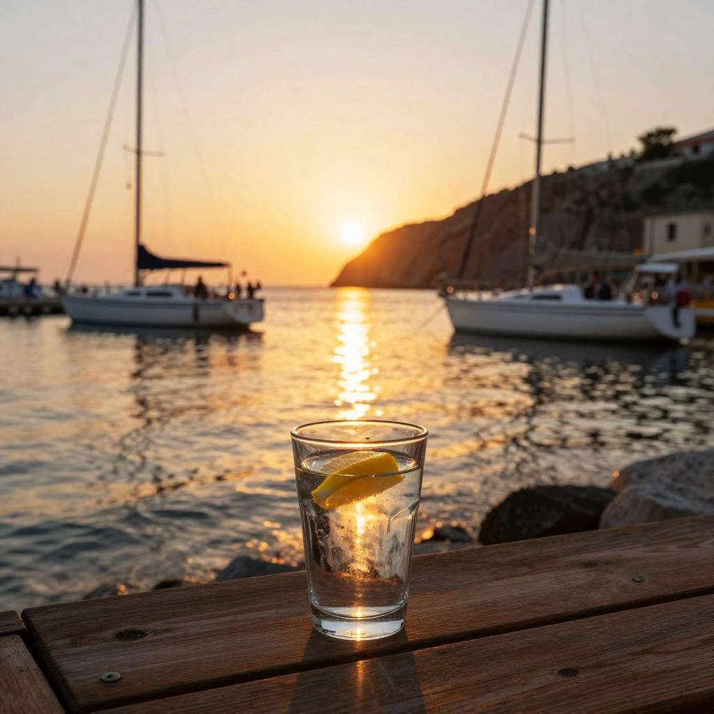 Photograph of a tranquil sunset scene at a marina. A glass of water with a lemon slice sits on a wooden deck in the foreground, catching the warm golden light. In the background, blurred sailboats are docked along rocky cliffs, with the sun low on the horizon, casting a beautiful reflection on the calm water. The overall mood is peaceful and relaxing.
