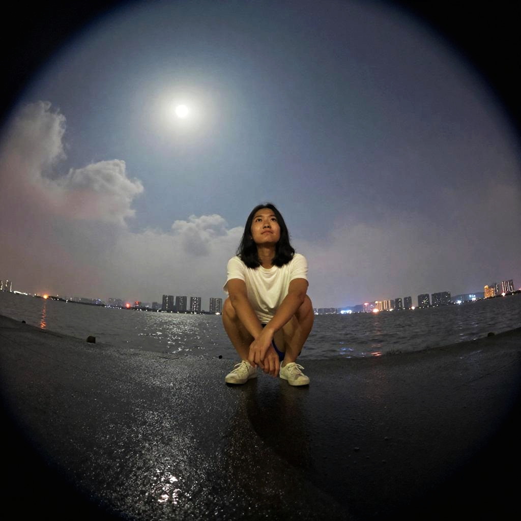 A young Asian woman with medium-length black hair wearing a white t-shirt and white sneakers squats on a wet pavement by the ocean. The city skyline with illuminated high-rise buildings is visible in the distance under a night sky with a bright moon and scattered clouds. The photo is taken with a fisheye lens at a very low angle, capturing reflections on the wet ground and a soft city glow.