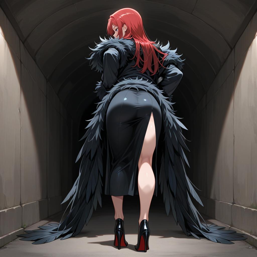 1girl, red hair, black feather coat, high heel, tunnel, full body