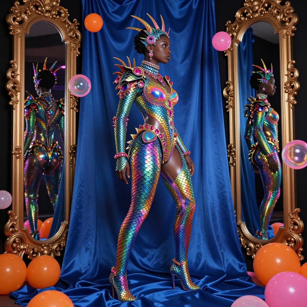 Photograph of a Black woman with dark skin standing confidently in front of two ornate gold mirrors. She is adorned in a vibrant, multicolored, iridescent bodysuit and matching headdress, with intricate, sparkling patterns. Her outfit includes a high-neck, long-sleeve top and high-waisted bottoms that accentuate her toned physique. She wears high-heeled shoes that match her suit. The background features a rich, royal blue satin curtain. Scattered orange and pink balloons add a festive touch. The mirrors reflect her striking attire, enhancing the visual impact. The image has a high-fashion, avant-garde aesthetic with a bold, colorful palette.