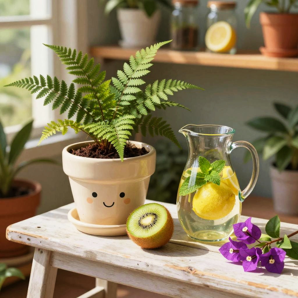 A playful, vibrant still life on a sunlit botanical conservatory bench, featuring ivory ceramic planter with ferns, ripe kiwi halves, glass pitcher with lemon and mint, deep violet bougainvillea blossoms. Rendered in detailed botanical illustration, with warm sunlight, soft shadows, bold color blocking, tactile textures, and a softly blurred shelf of plants and jars in the background; balanced composition, cozy domestic ambiance, shallow depth of field.