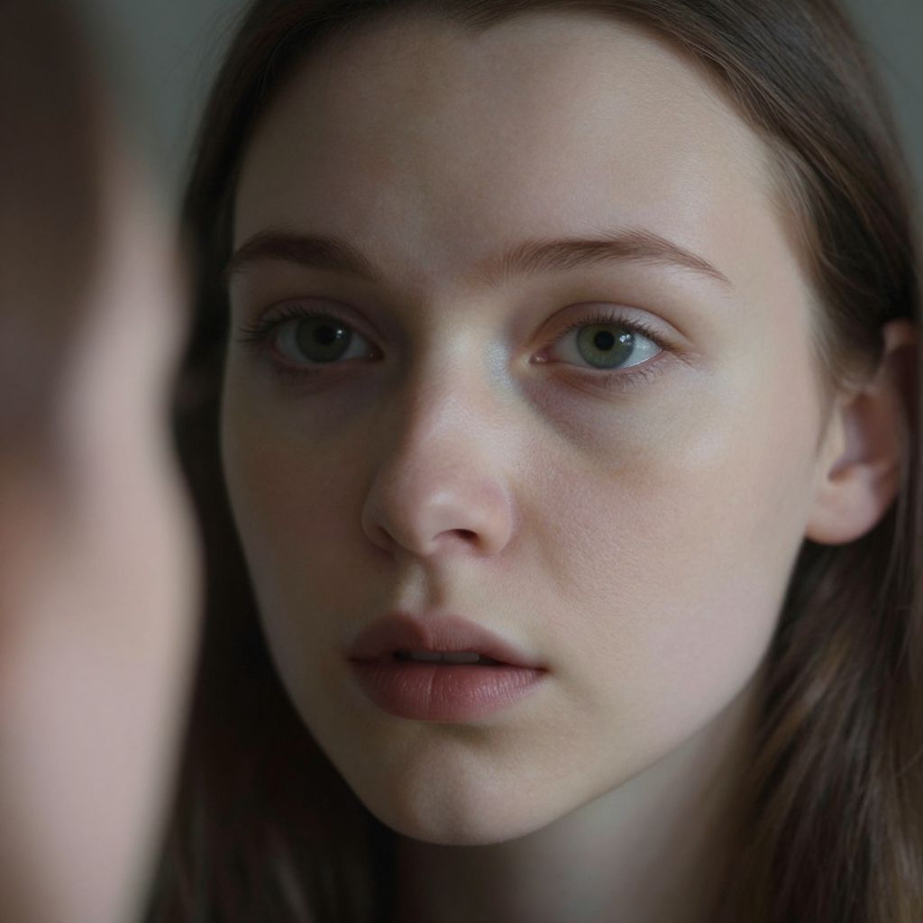 Imagine a captivating portrait showcasing an enigmatic figure with clouded green eyes and smooth pale skin. Their expression—a subtle fusion of curiosity and contemplation—invites intrigue and empathy from viewers. Captured from an unconventional angle, as if viewed through a warped mirror, the image maintains exquisite detail in every wrinkle and freckle across their face. Soft ambient light bathes the scene, creating an ethereal glow that accentuates the delicate interplay of shadows and highlights on their skin while hinting at complexities beneath the surface. This innovative blend of realism with surreal perspective crafts an emotional gradient, drawing audiences into a captivating exploration of human depth and individuality.