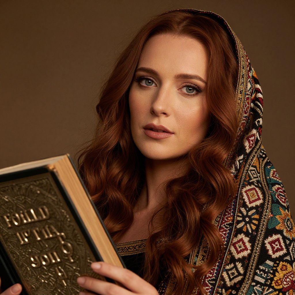 Photograph of a fair-skinned woman with long, wavy brown hair, wearing a patterned headscarf with intricate designs in red, blue, and gold. She has striking blue eyes and light makeup, including pink lipstick. She holds an ornately embossed book with the words "Bible Study" visible. The background is a solid, warm brown, emphasizing her focused expression. The lighting highlights her facial features and the texture of her headscarf, creating a soft, inviting atmosphere. The image has a slightly vintage, romantic aesthetic.