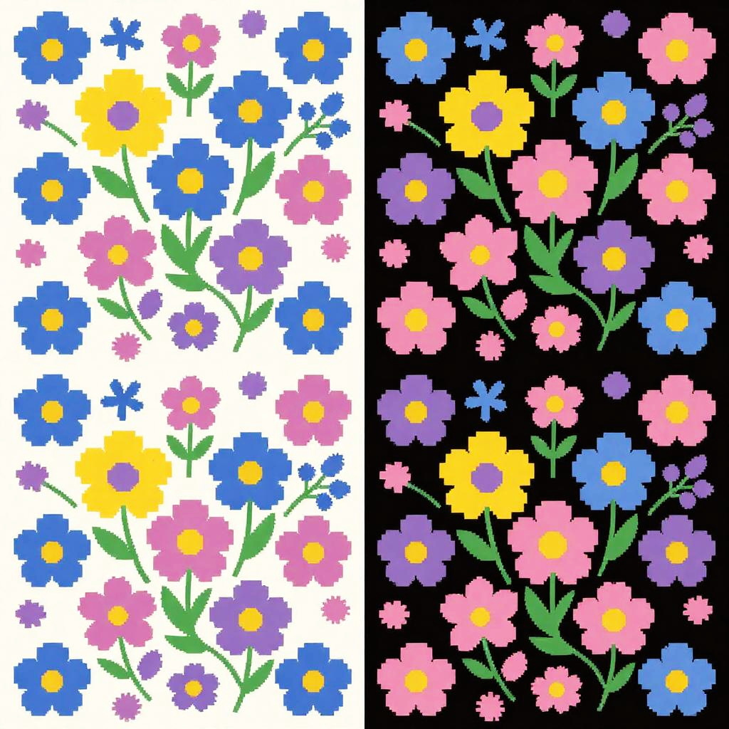 This image is a digital collage featuring four quadrants, each filled with a dense, colorful floral pattern. The top-left and bottom-right quadrants have flowers on a white background, while the top-right and bottom-left quadrants have flowers on a black background. The flowers are in various colors including blue, yellow, pink, and purple, with green leaves interspersed. The overall style is bright, lively, and pixelated.
