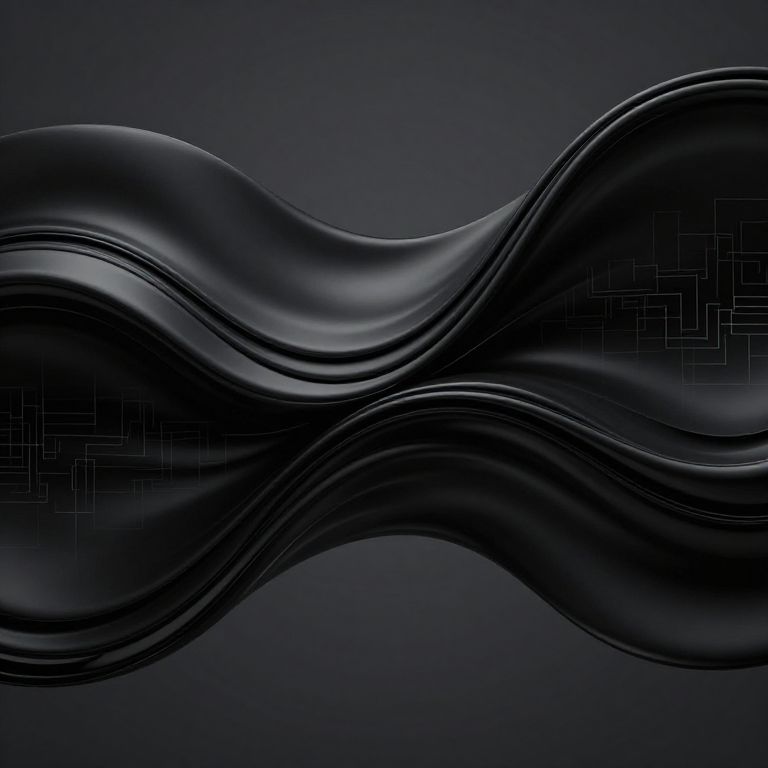 This digital abstract art image features smooth, wavy black shapes resembling fluid, undulating waves against a dark, gradient blue background. The waves have a glossy, almost metallic texture, with subtle reflections adding depth. A faint, geometric pattern is visible on the right side of the waves, adding a subtle contrast to the otherwise flowing forms. The overall composition is sleek and modern, with a focus on symmetry and movement. The image evokes a sense of fluidity and elegance, with a minimalist yet dynamic aesthetic.