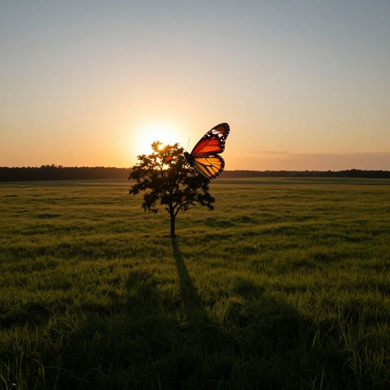 A serene sunset landscape viewed from an elevated perspective, showcasing a vast expanse of verdant meadow leading to a distant horizon. A solitary tree stands prominently in the foreground, its shadow stretching long and dark across the golden field as the sun sets, casting a warm glow that bathes everything in soft light and deepening shadows. The tranquil scene is disrupted by the emergence of an ethereal pair of butterfly wings from behind the tree, their vibrant hues contrasting vividly with the muted palette of the landscape, instilling a sense of awe, peace, and subtle unease within the observer.