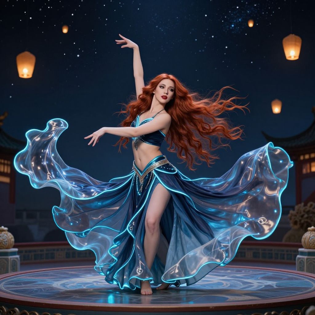 A mysterious female dancer in her mid-20s with deep red lips and long, flowing auburn hair performs in a mystique costume with glowing blue trim and moving fabric that shifts like water, set against a surreal, circular stage under a starry night sky with floating lanterns.
