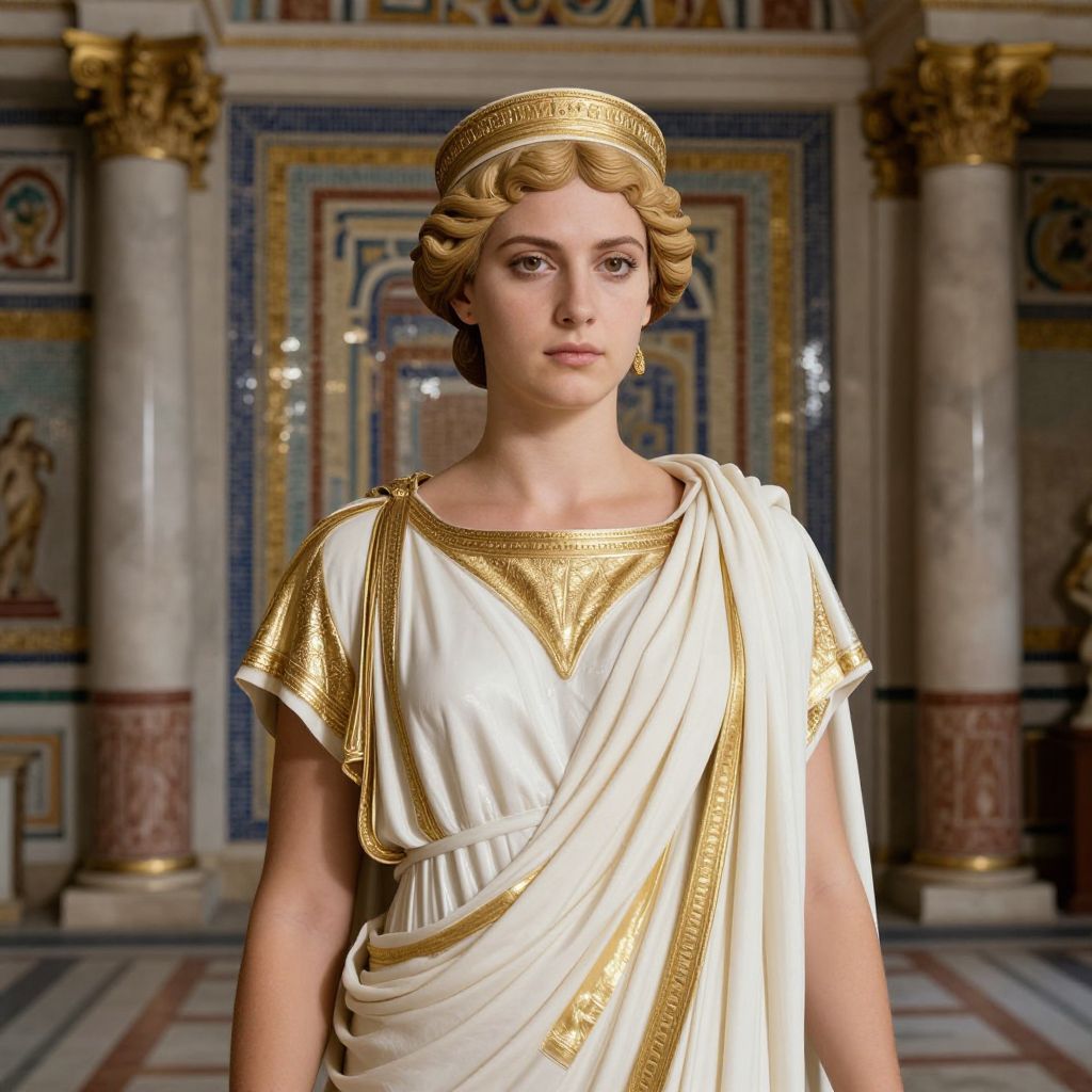 Photograph of a young woman with fair skin and blonde, wavy hair styled in soft curls, wearing a white toga with gold-trimmed edges. She has a golden headband and is standing in an opulent, classical-style room with marble columns and intricate mosaic patterns on the walls. Her expression is calm and composed. The background features rich, multi-colored mosaics and ornate architectural details. The lighting is soft, highlighting her classical attire and the luxurious setting. The overall scene evokes ancient Roman or Greek elegance.