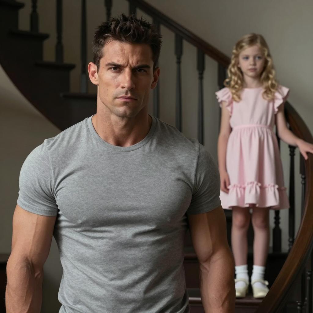 A muscular man with short, dark hair in a tight gray t-shirt in the foreground, looking serious. A young girl with blonde, curly hair in a pink, ruffled dress stands on a dimly lit, spiral staircase in the background. The man is in the left foreground, girl is in the right background.