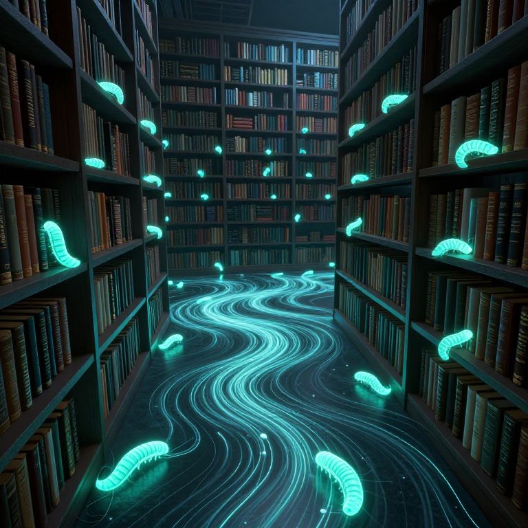 In a cyberpunk-inspired 3D-rendered library, towering shelves brimming with books are illuminated by bioluminescent inkworms that weave intricate patterns on the floor, creating an endlessly shifting manuscript with trails of glowing ink in a high-definition, otherworldly atmosphere.