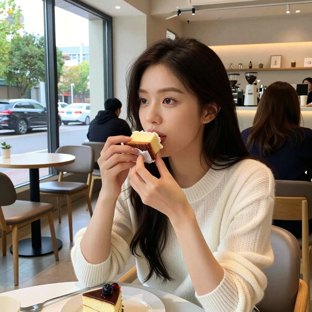 A photograph of an Asian woman with long, dark hair and fair skin, wearing a white knitted sweater. She's sitting in a modern café, biting into a small cake while holding another piece. In front of her is a plate with a topped cake. The background shows large windows, a street with cars, and other café patrons. The lighting is bright and natural.