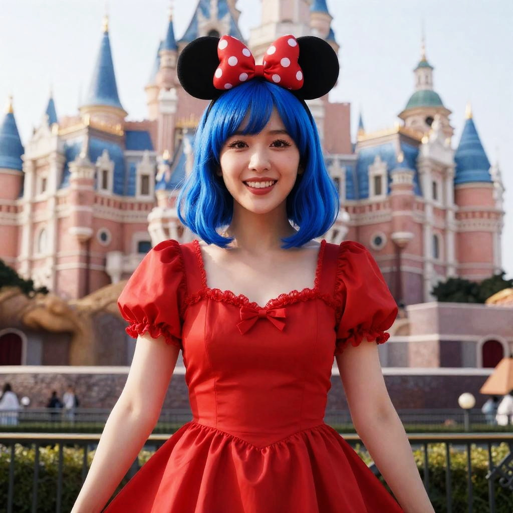 Photograph of an Asian woman with blue bob hair, red dress, and Minnie Mouse ears with a red polka-dot bow, smiling in front