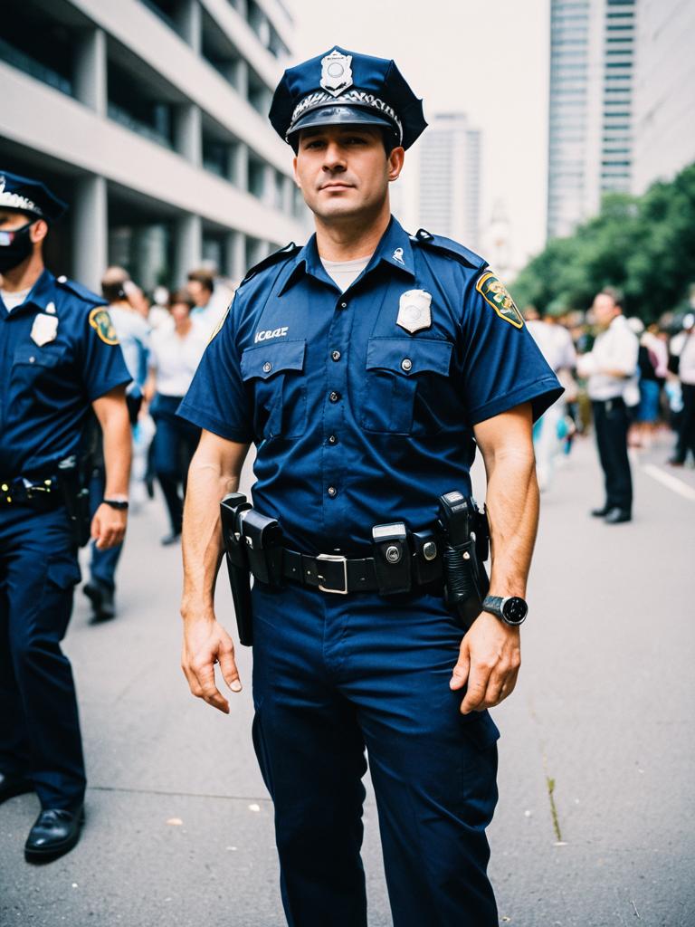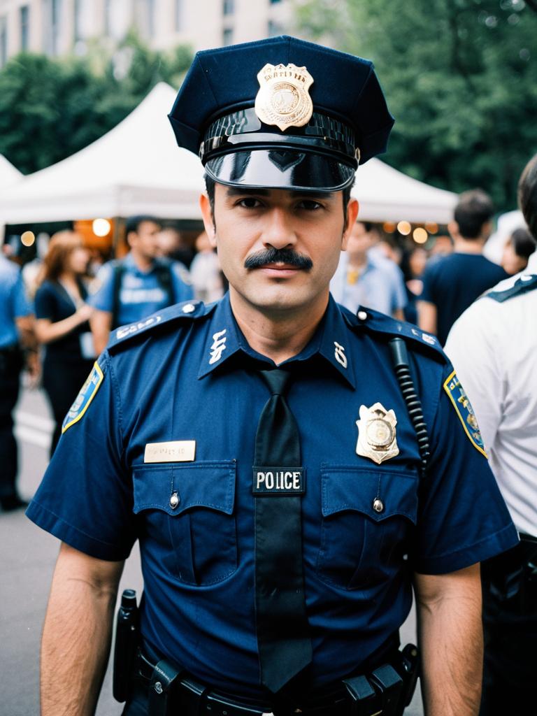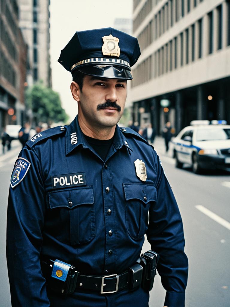 Close-up portrait of a male police officer in a blue uniform and cap with police insignia, standing outdoors in an urban environment with blurred people in the background. The officer is clean-shaven, with dark hair and a focused expression.