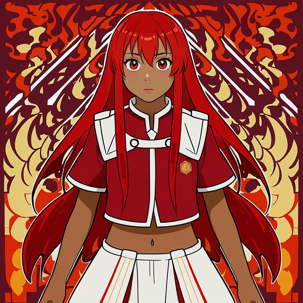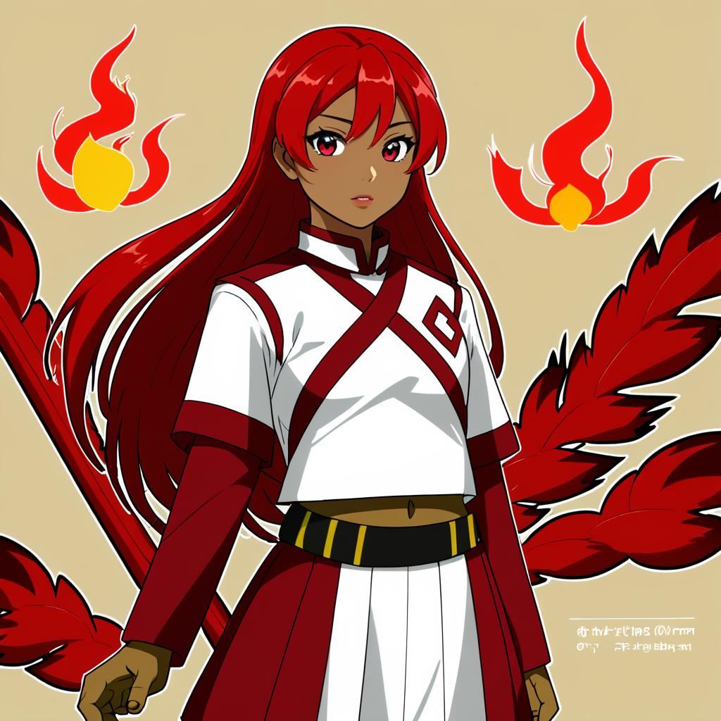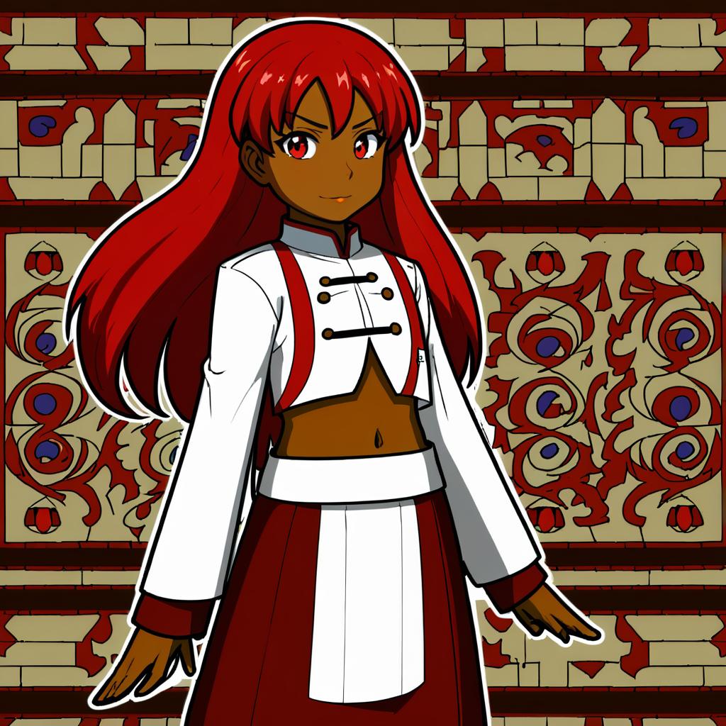 Digital anime-style illustration of a dark-skinned female character with long red hair and red eyes wearing a cropped Garreg Mach Monastery uniform. The character stands against a beige background with stylized red flames and feathers. Her clothing includes a white and red crop top with a high collar and long red sleeves, paired with a white skirt and a black belt with yellow stripes. The art style is influenced by the Fire Emblem game series.