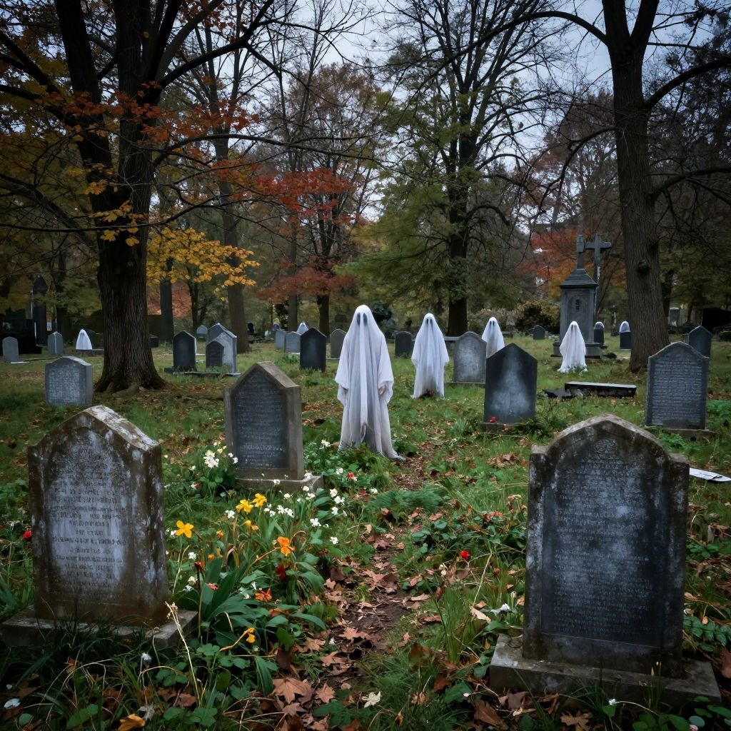 Photograph of a spooky graveyard with white ghostly figures among autumn-colored trees, weathered tombstones, and vibrant wildflowers in the foreground.