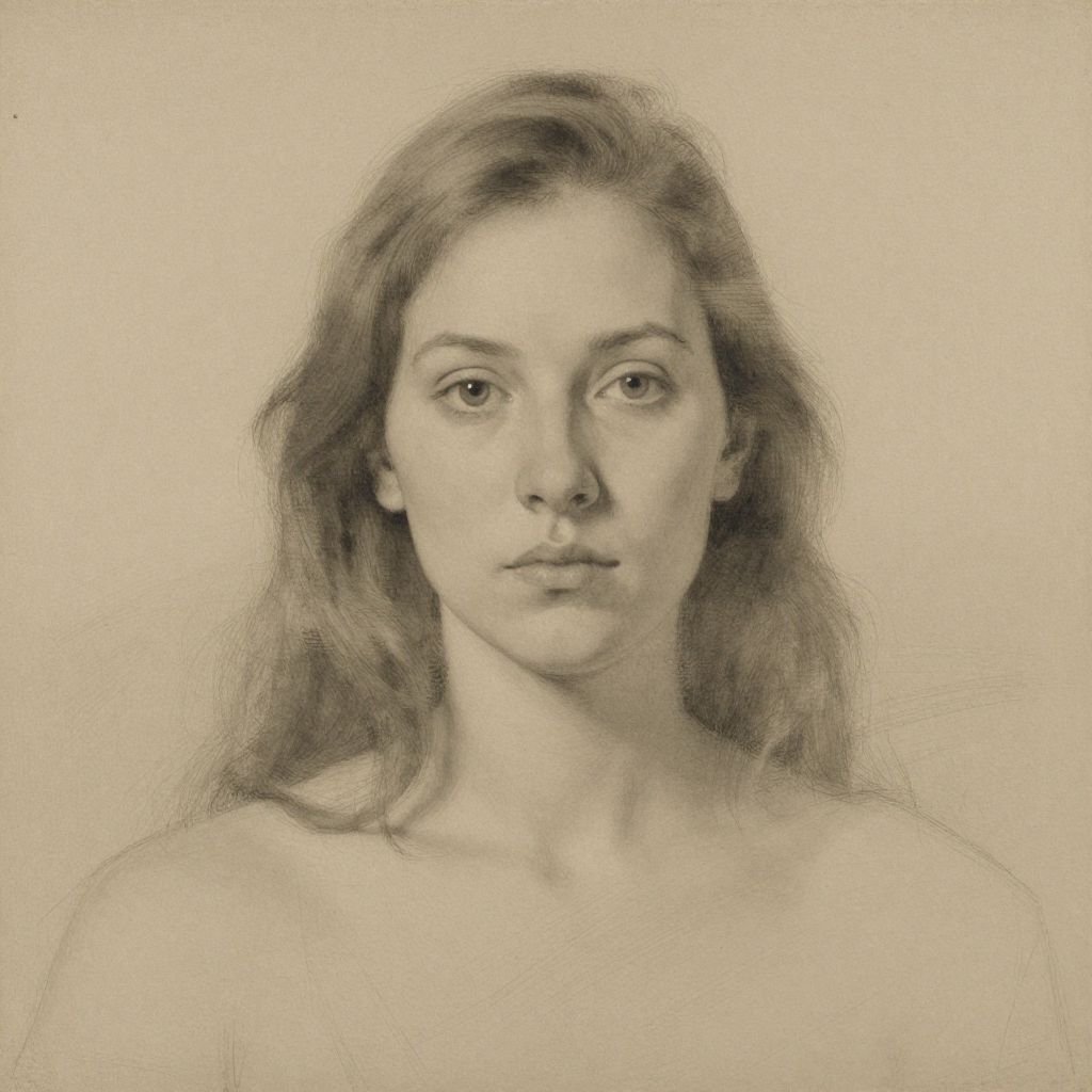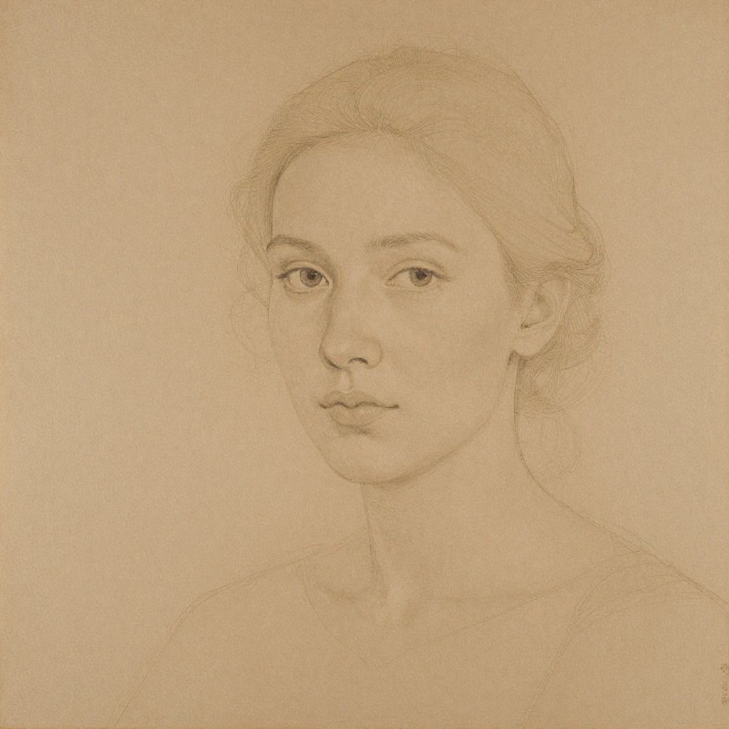This is a finely detailed pencil drawing of a young woman's portrait on a beige, textured paper. The woman has a calm, neutral expression with slightly parted lips and wide, gentle eyes. Her hair is softly drawn, pulled back, and appears to be light-colored. The sketch focuses on her face and upper shoulders, with delicate shading that gives depth to her features. The background is plain, emphasizing the subject. The overall style is realistic, with delicate, precise lines capturing the natural beauty and subtle details of her face.
