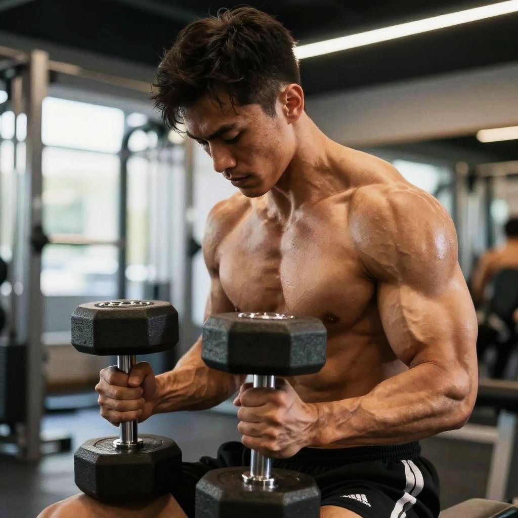 Muscular Bodybuilder Lifting Dumbbells