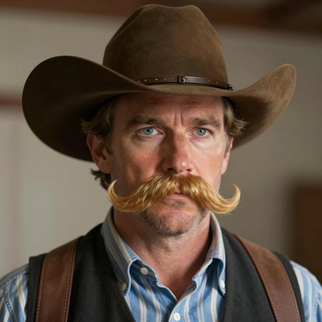 Costume man mustaches, photorealistic, close-up, man, Western style, digital art, detailed, brown cowboy hat, large golden mustache, blue and white striped shirt, black vest, brown suspenders, serious expression, front view, background blurred, soft lighting, realistic ures, mature man, blue eyes