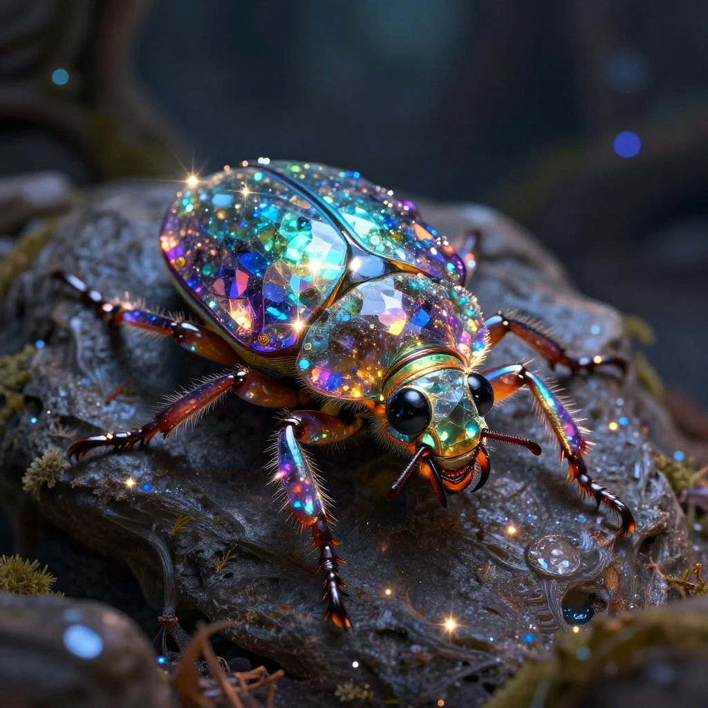 Vibrant glowing crystal beetle, dark enchanted cave, fantasy digital illustration, sparkling highlights and reflective surfaces, rendered with Unreal Engine, high resolution, shot on 90mm lens, depth of field, intricate and beautifully color-coded details.