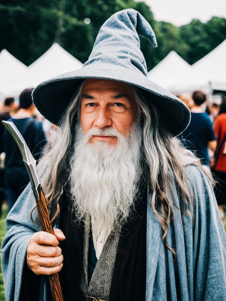 Man in Gandalf costume, photorealistic cosplay festival portrait