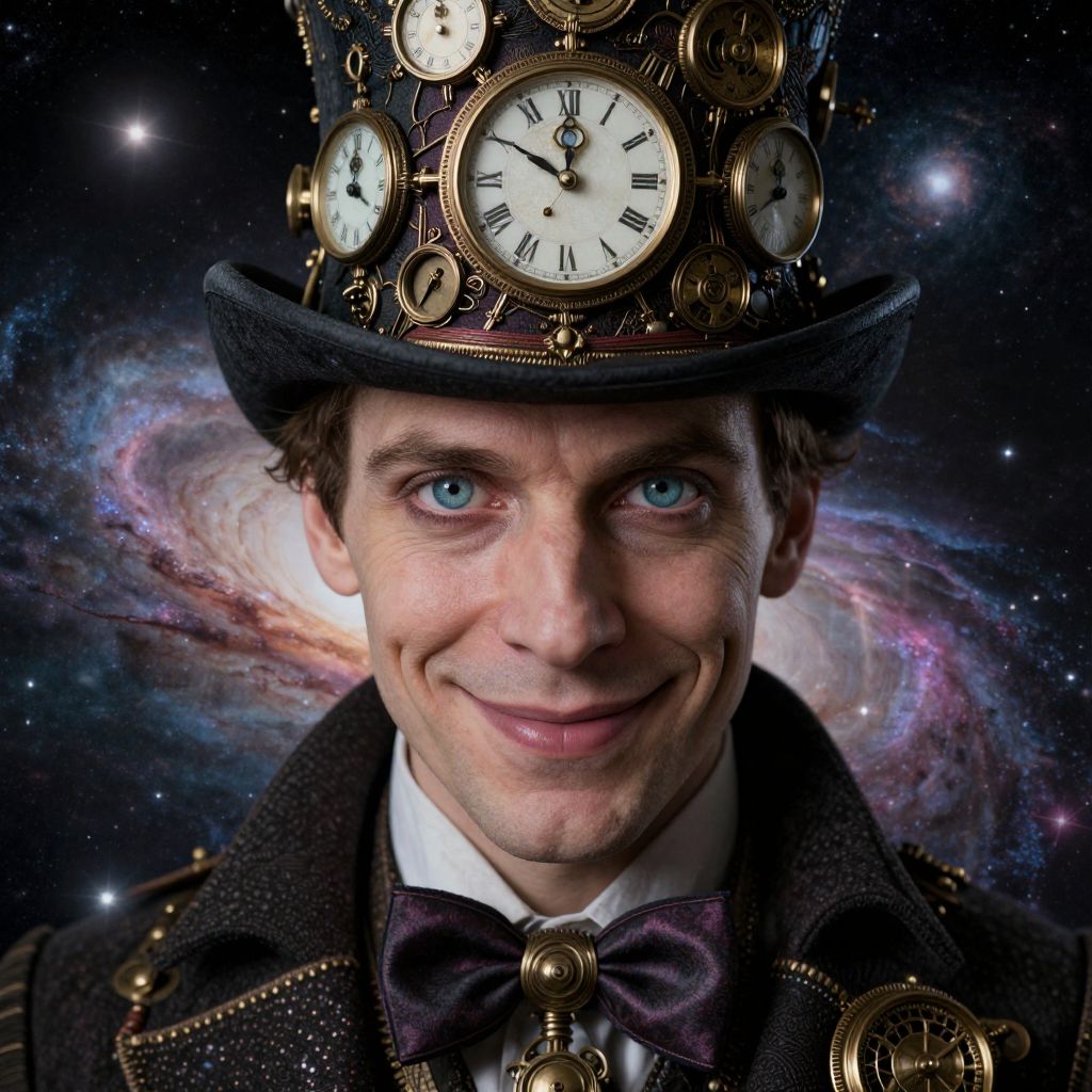Create an enigmatic portrait of a jovial entertainer dressed in a flamboyant, oversized hat embellished with intricate stained glass designs reminiscent of the golden phase. The performer's face is partially concealed by a comical, asymmetrical nose as he twists his body into an extraordinary position that challenges our perception of reality, hovering above a surreal landscape composed of melting hourglasses and fractured planes in the style of Salvador Dali. This whimsical scene encourages contemplation on the nature of existence while embracing the joyous absurdity of life.