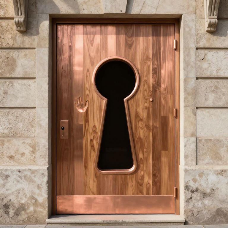 Low Poly large wood and copper door set against a stone wall with an oversized keyhole in the center and a handprint shaped indent, v 5,