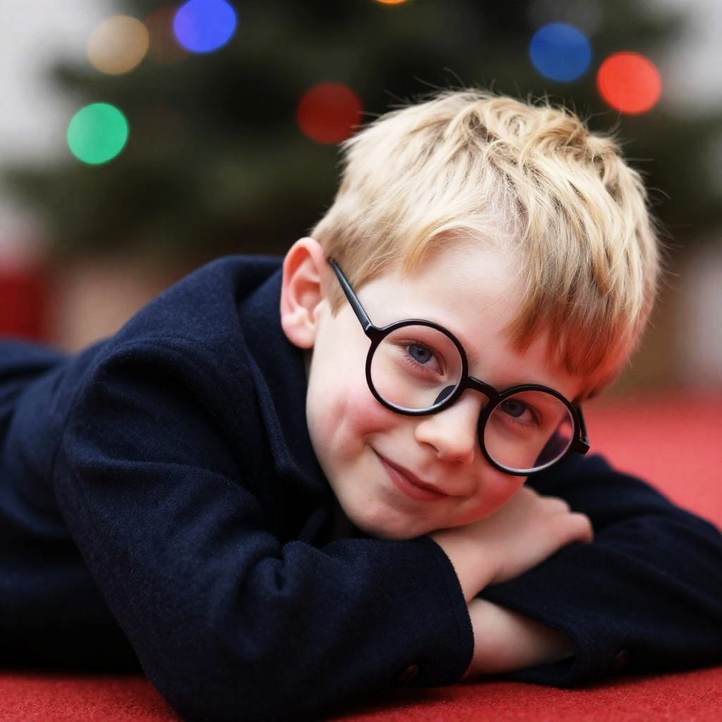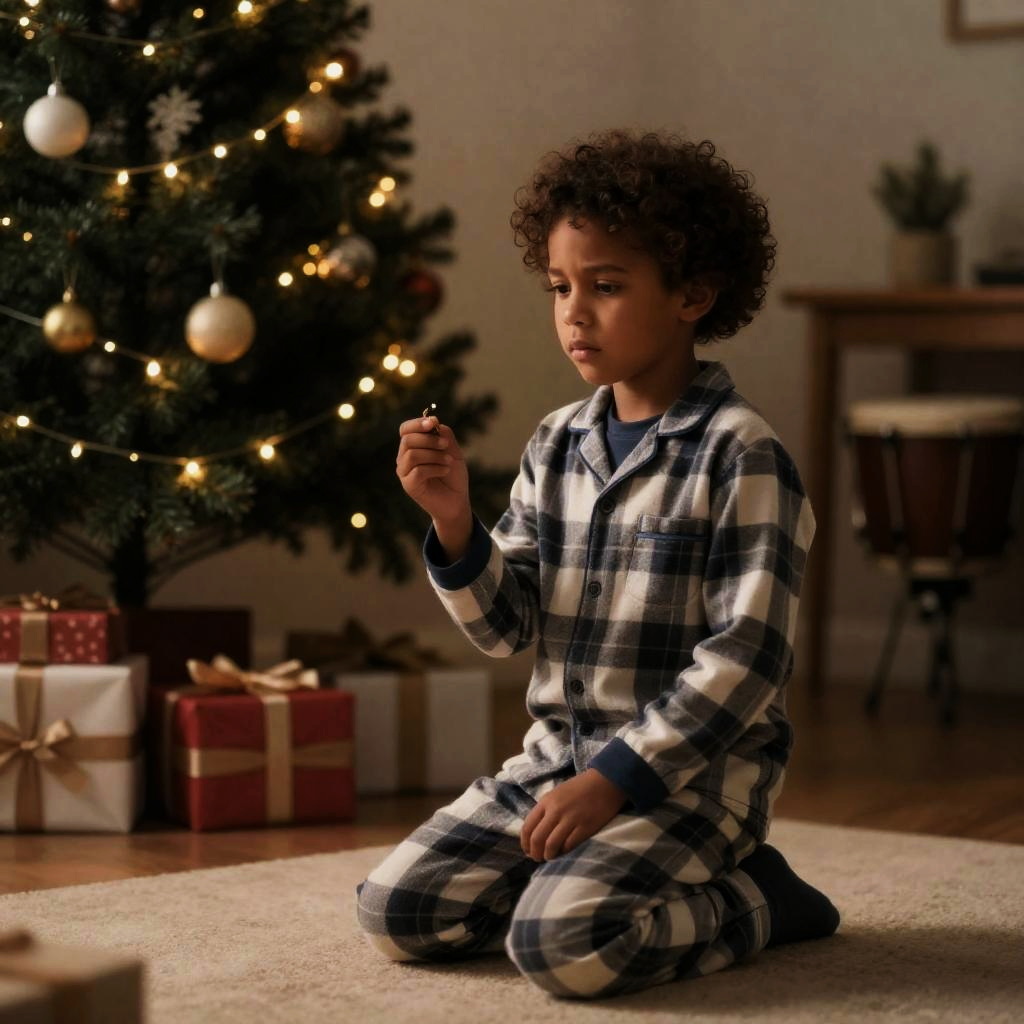 Blond boy in checkered pajamas with glasses holds pink stuffed animal blanket with bunny ears, standing in front of decorated Christmas tree. Background has framed pictures and a globe. Boy's expression is neutral. Indoor setting.