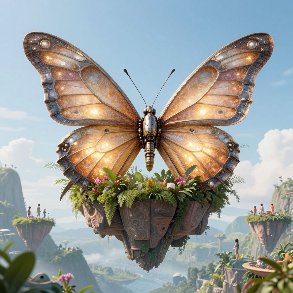 Giant, mechanical butterflies with intricate, glowing wings carry a lush, floating island across a serene landscape of suspended ecosystems, where children explore a world defying gravity and imagination.