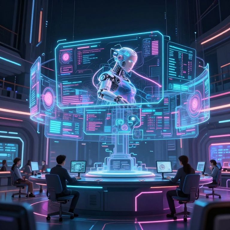 Neon-lit futuristic control room with holographic central figure, surrounded by glowing blue and pink tech screens, and four seated operators. Digital art style