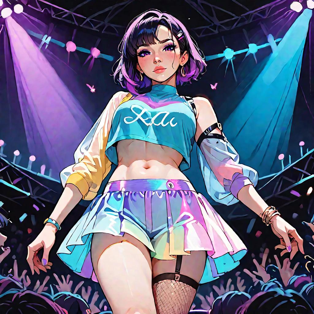 Score_9, score_6_up, source_anime, 1girl, solo, stage, concert, purple lights, towa_break, two-tone shirt, see-through skirt, navel, fishnet thighhighs, single thighhigh, asymmetrical sleeves, jewelry