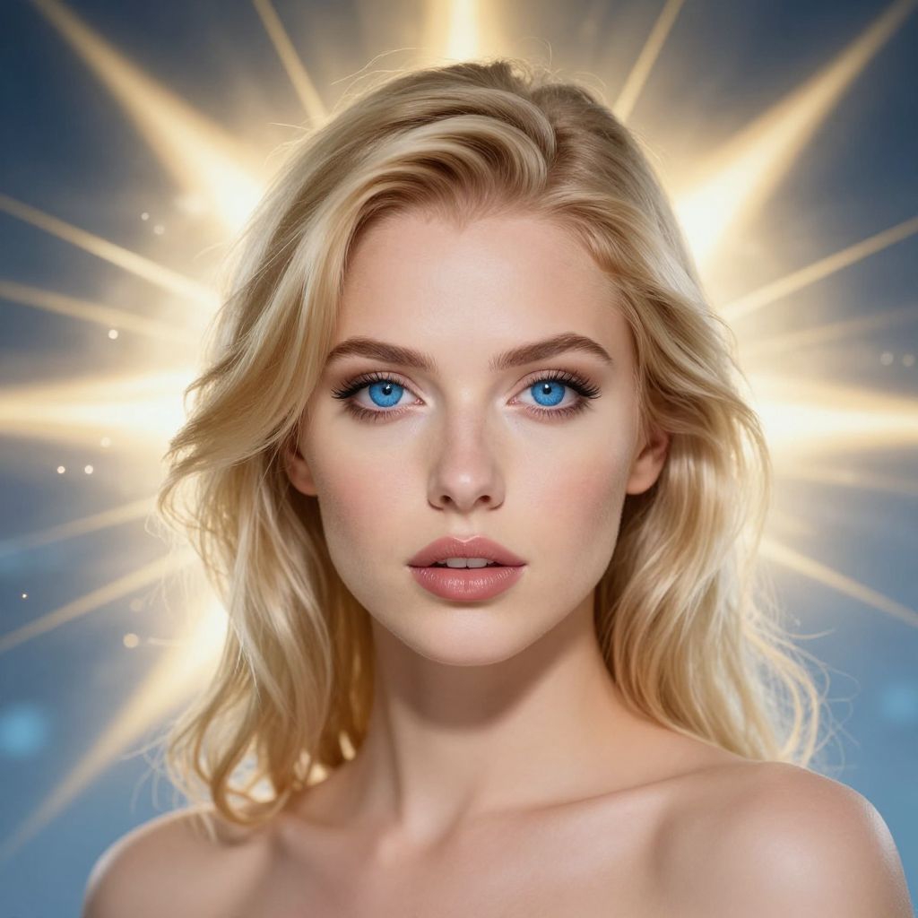 A woman with blonde hair and blue eyes is surrounded by a radiant, star-like halo with golden and blue hues.