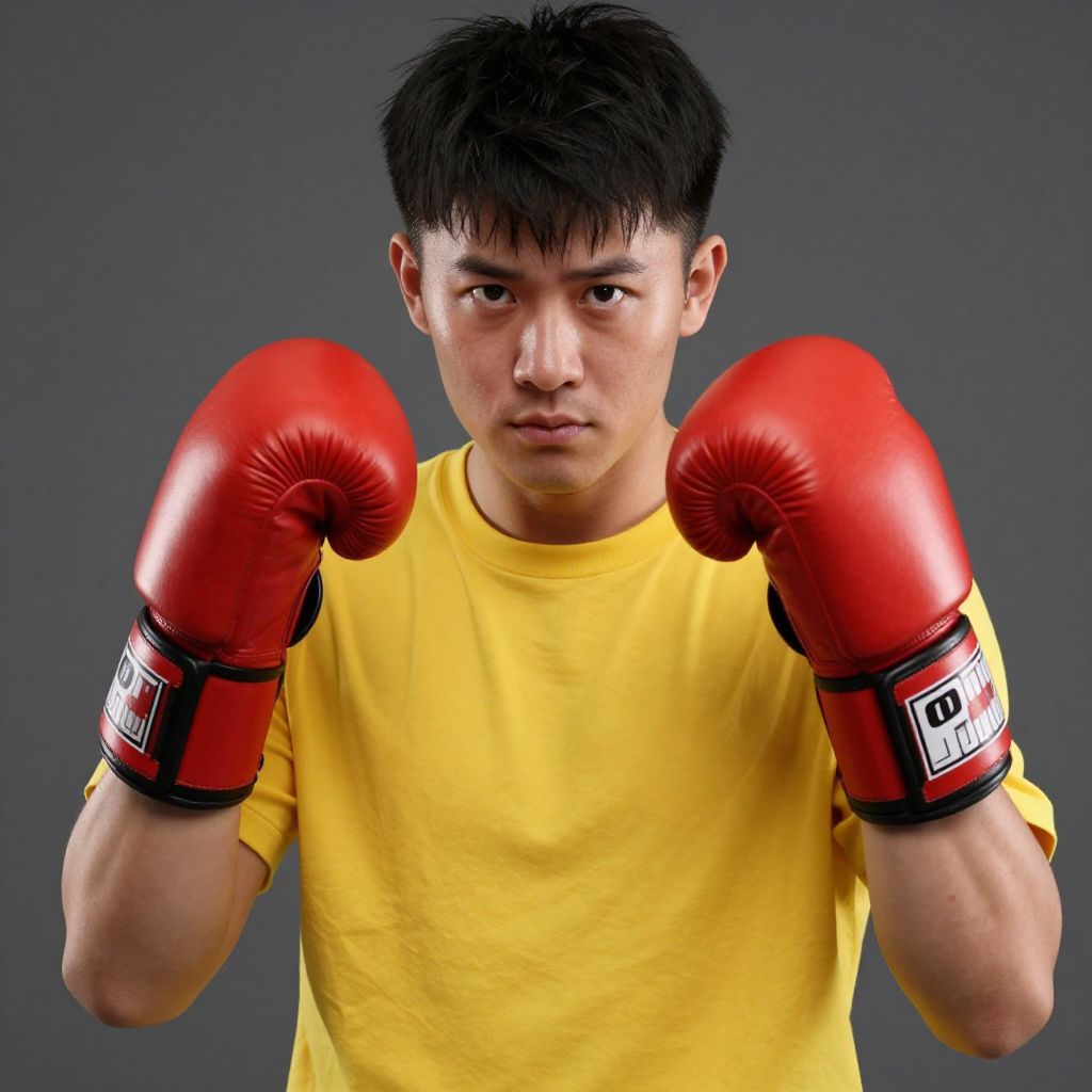 One Punch Boy, man in a yellow shirt and red boxing gloves