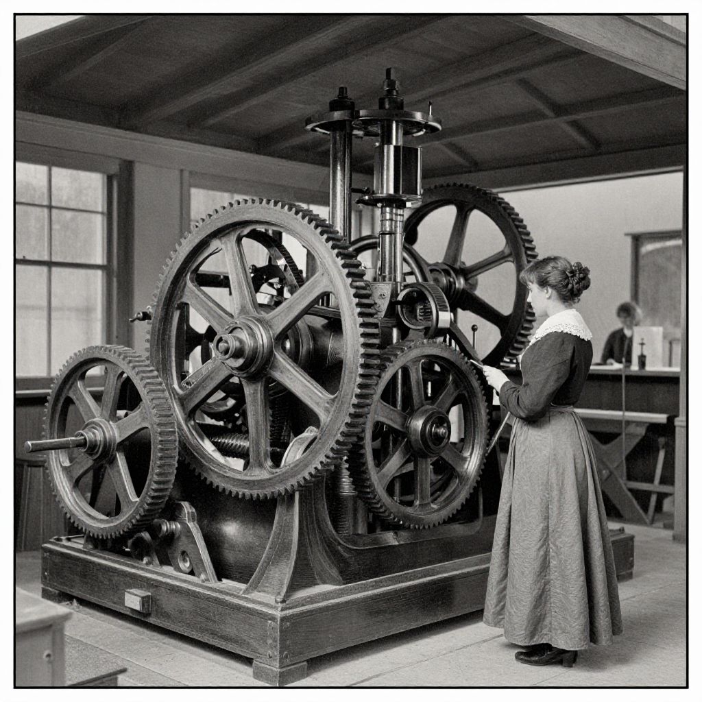 Black-and-white photograph of a Victorian-era woman in a long skirt and white blouse, operating large, intricate steam-powered gears in a workshop with wooden beams