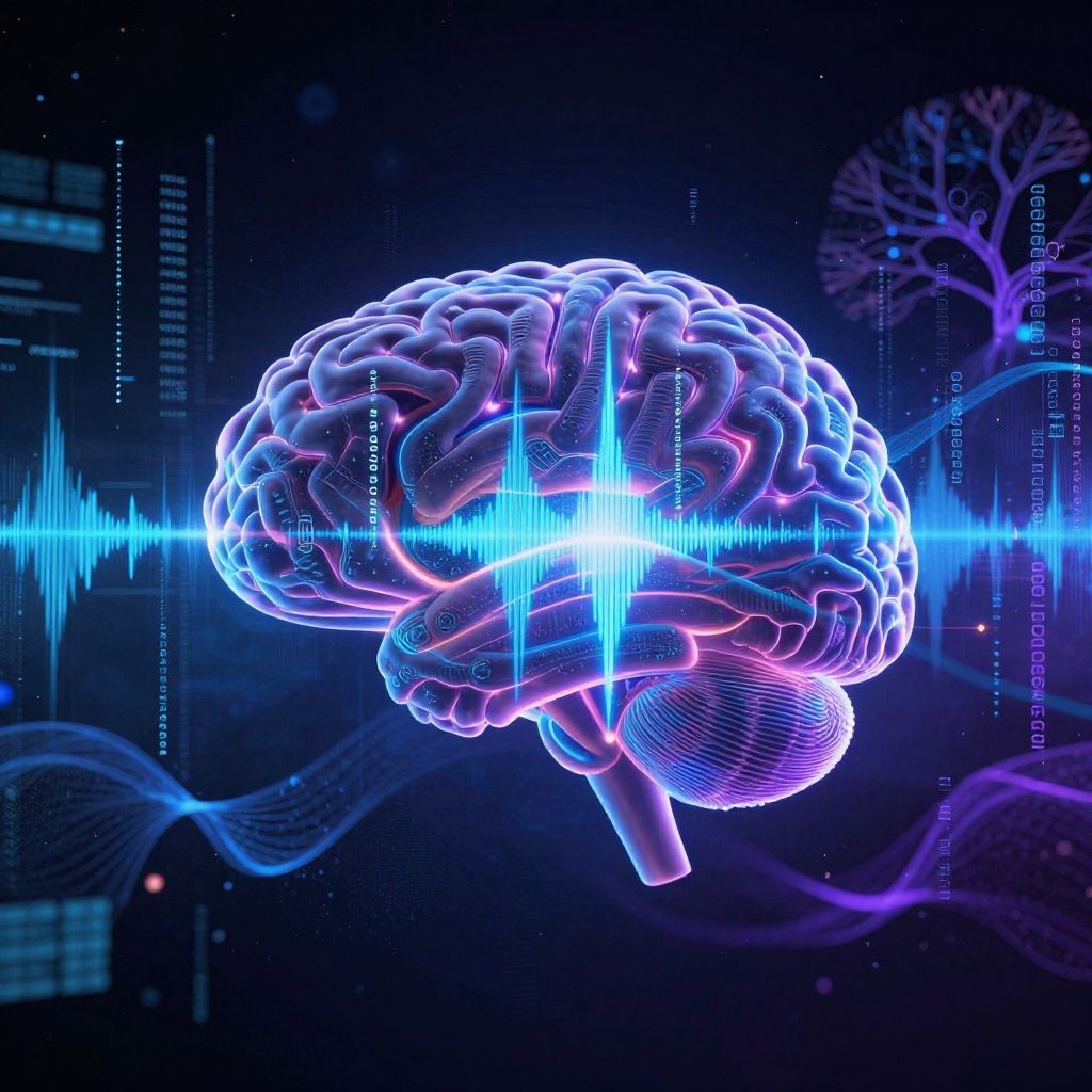 Digital CGI of a glowing, neon-blue and purple human brain with vibrant light waves and bio-signal lines in the background.